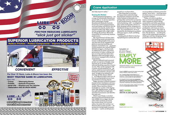 The manufacturer’ s E-Line material-handling aerial work platforms feature working heights from 120 to 240 feet and can be equipped with platform material-handling and Category A insulation configurations. E-Line products also include Elliott’ s EZ Crib outriggers, which provide an additional 30 inches of vertical penetration to reduce cribbing and save on setup and tear-down time. Machines with work heights above 160 feet are equipped with a built-in anemometer.