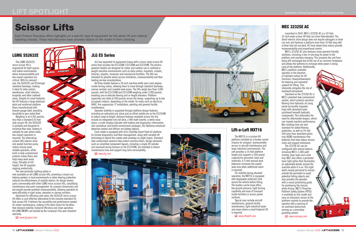 JLG has expanded its equipment lineup with a micro-sized scissor lift series that includes the ES1330M, ES1530M and ES1930M. The electricpowered models are designed for indoor and outdoor use in confined or weight-sensitive environments such as data centers, hospitals, schools, libraries, airports, museums and commercial facilities. The lifts are intended for jobsites where access limitations, maneuverability and floor loading are key considerations.
