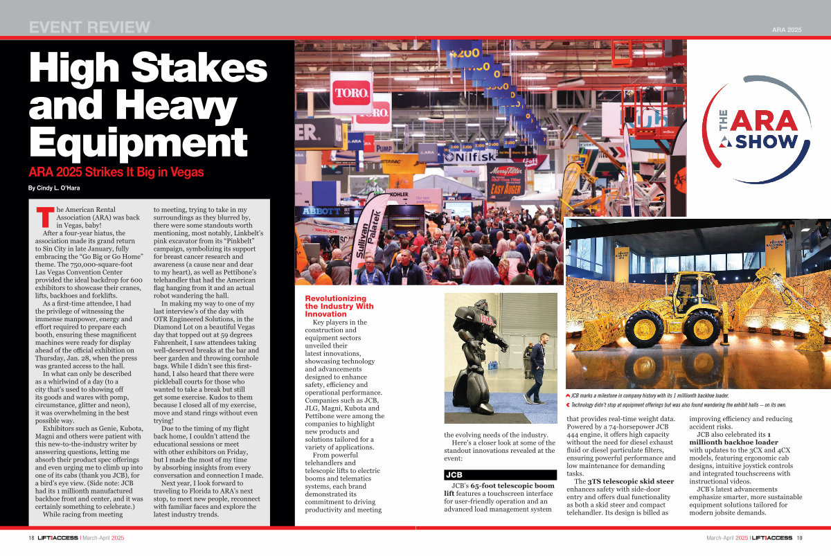 The American Rental Association( ARA) was back in Vegas, baby! After a four-year hiatus, the association made its grand return to Sin City in late January, fully embracing the“ Go Big or Go Home” theme. The 750,000-square-foot Las Vegas Convention Center provided the ideal backdrop for 600 exhibitors to showcase their cranes, lifts, backhoes and forklifts.