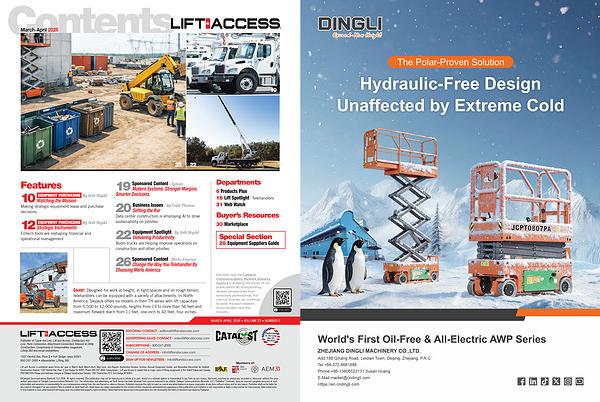 Lift and Access is published seven times per year in March-April, March-April, May-June, July-August, September-October, October( Annual Equipment Guide), and November-December by Catalyst Construction Division, 1207 Central Ave, Floor 2, Fort Dodge, IA 50501, Phone 800-247-2000. Subscription: Lift and Access is mailed free to major users of lifting equipment in the United States and Canada. POSTMASTER: Please send address changes to Catalyst Construction Division, 1207 Central Ave, FL 2, Fort Dodge, IA 50501.
