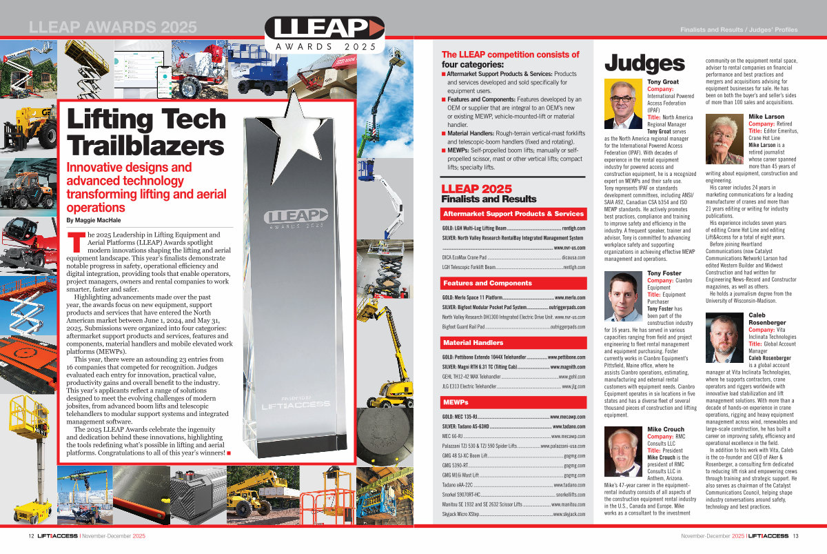 The 2025 Leadership in Lifting Equipment and Aerial Platforms( LLEAP) Awards spotlight modern innovations shaping the lifting and aerial equipment landscape. This year’ s finalists demonstrate notable progress in safety, operational efficiency and digital integration, providing tools that enable operators, project managers, owners and rental companies to work smarter, faster and safer.