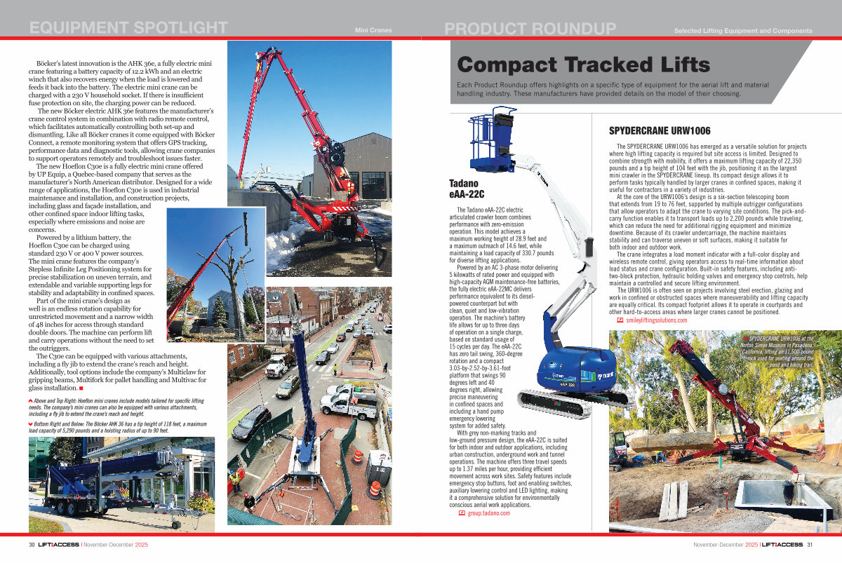 The new Hoeflon C30e is a fully electric mini crane offered by UP Equip, a Quebec-based company that serves as the manufacturer’ s North American distributor. Designed for a wide range of applications, the Hoeflon C30e is used in industrial maintenance and installation, and construction projects, including glass and façade installation, and other confined space indoor lifting tasks, especially where emissions and noise are concerns.
