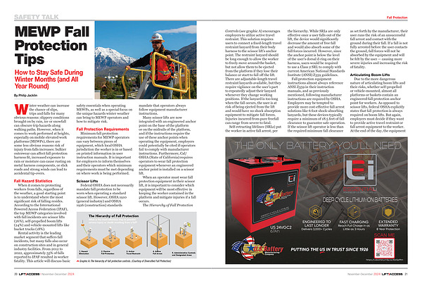 Rental activity is the leading market segment that suffers fall incidents, but many falls also occur on construction sites and in general industry facilities. From 2012 to 2022, approximately 55 % of falls reported to IPAF resulted in worker fatality. This article will discuss basic safety essentials when operating MEWPs, as well as a special focus on the unique hazards winter weather can bring to MEWP operators and how to mitigate risk.