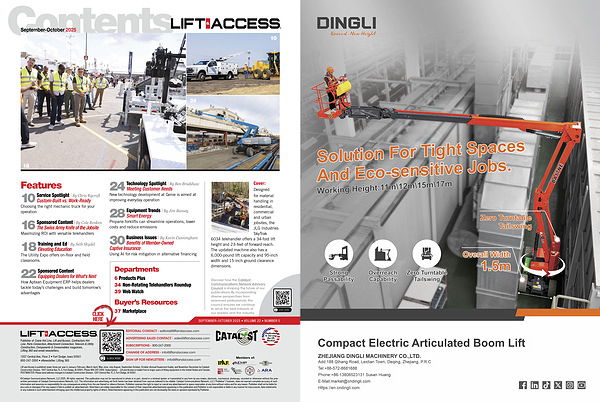 Lift and Access is published seven times per year in January-February, March-April, May-June, July-August, September-October, October( Annual Equipment Guide), and November-December by Catalyst Construction Division, 1207 Central Ave, FL 2, Fort Dodge, IA 50501, Phone 800-247-2000. Subscription: Lift and Access is mailed free to major users of lifting equipment in the United States and Canada. POSTMASTER: Please send address changes to Catalyst Construction Division, 1207 Central Ave, FL 2, Fort Dodge, IA 50501.